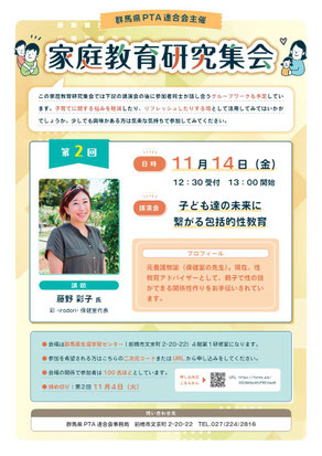 群馬県PTA連合会 家庭教育委員会が、中心となって毎年行っている家庭教育研究集会を今年も開催します。詳しくは、チラシでご確認ください。